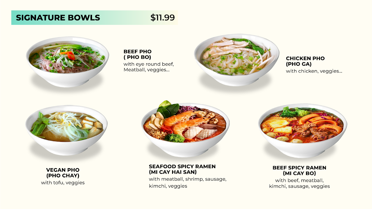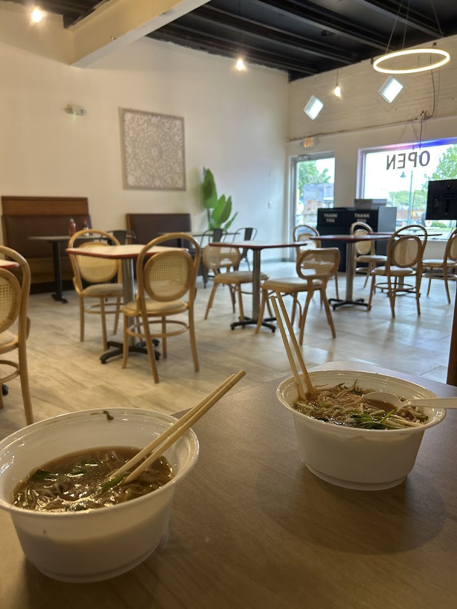 I bought the Beef Pho and mango smoothie with strawberry boba. Quiet and clean environment. Everything was delicious. They include a LOT on the to go orders. Veggies, chili sauce and hoisin/sriracha packets. Their broth is yummy enough on its own too! Plenty of meat and noodles too. They do up charge to use cards, that is my only con. Will absolutely be coming back! Super friendly staff and they work QUICK. my friend and I both ordered drinks n pho, we were in n out in 10 minutes max. Great addition to Johnson drive!